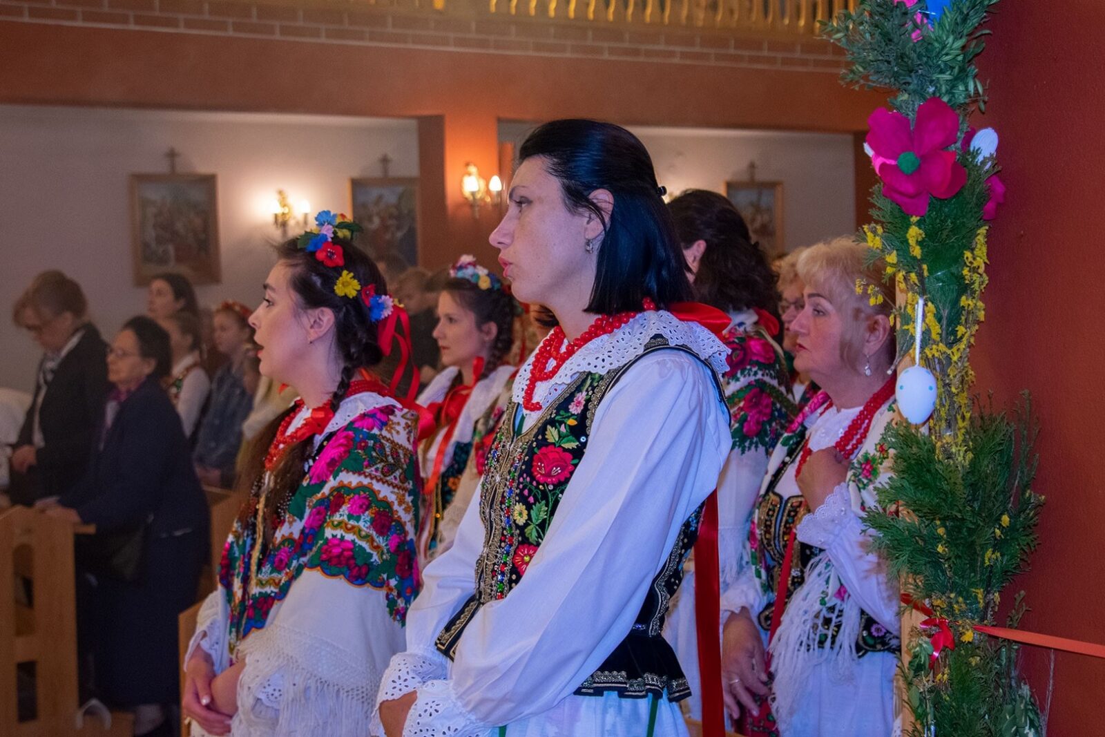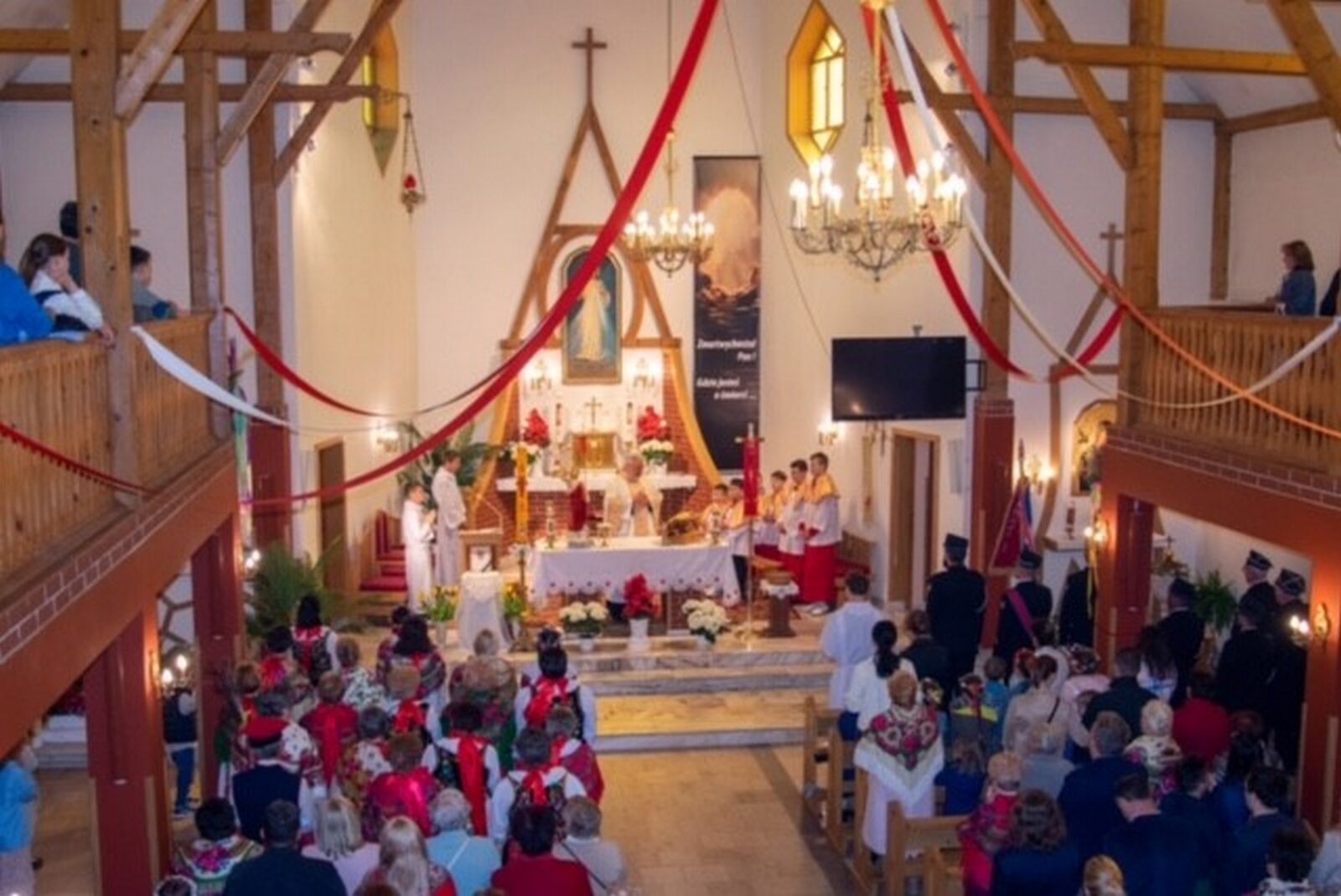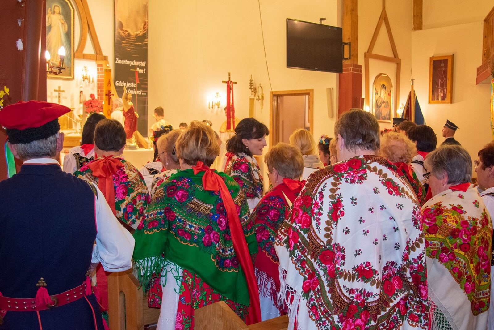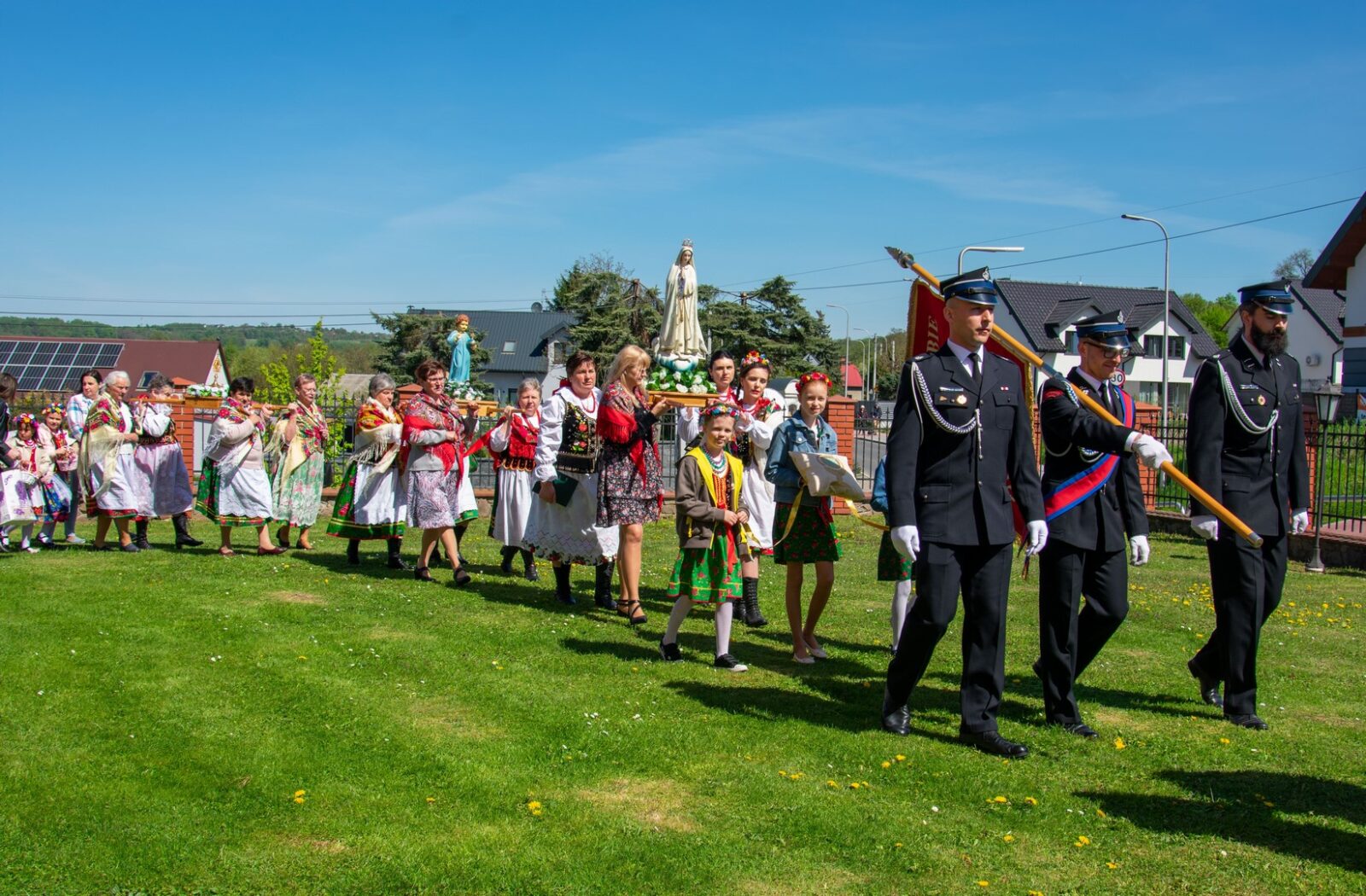 W uroczystości uczestniczyli licznie zgromadzeni parafianie. Wzięła w niej udział Służba Liturgiczna Ołtarza, dzieci w strojach komunijnych, parafianie w strojach regionalnych, strażacy z pocztem sztandarowym oraz panowie niosący baldachim.