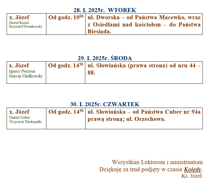 Warto odwiedziny kolędowe przeżywać w duchu radości bożonarodzeniowej, w duchu modlitwy, serdecznej rozmowy z duszpasterzami. Niech błogosławieństwo kolędowe chroni nasz dom, nasze rodziny i umacnia nas na drodze życia chrześcijańskiego!